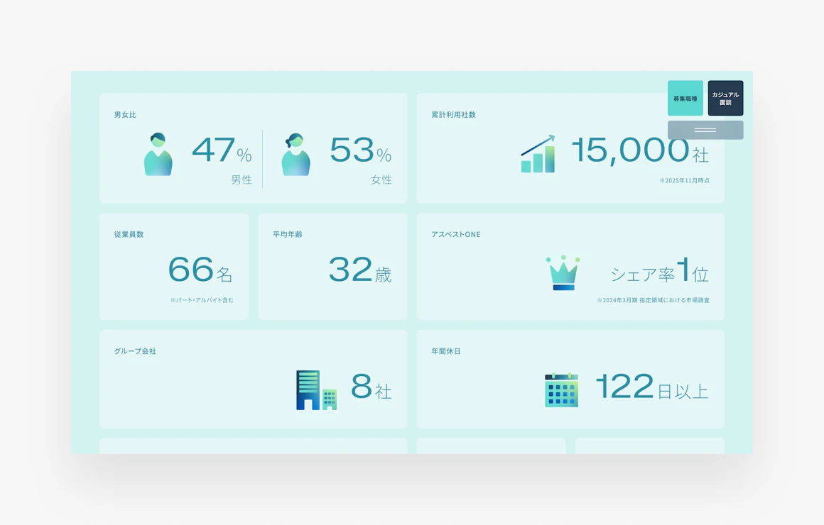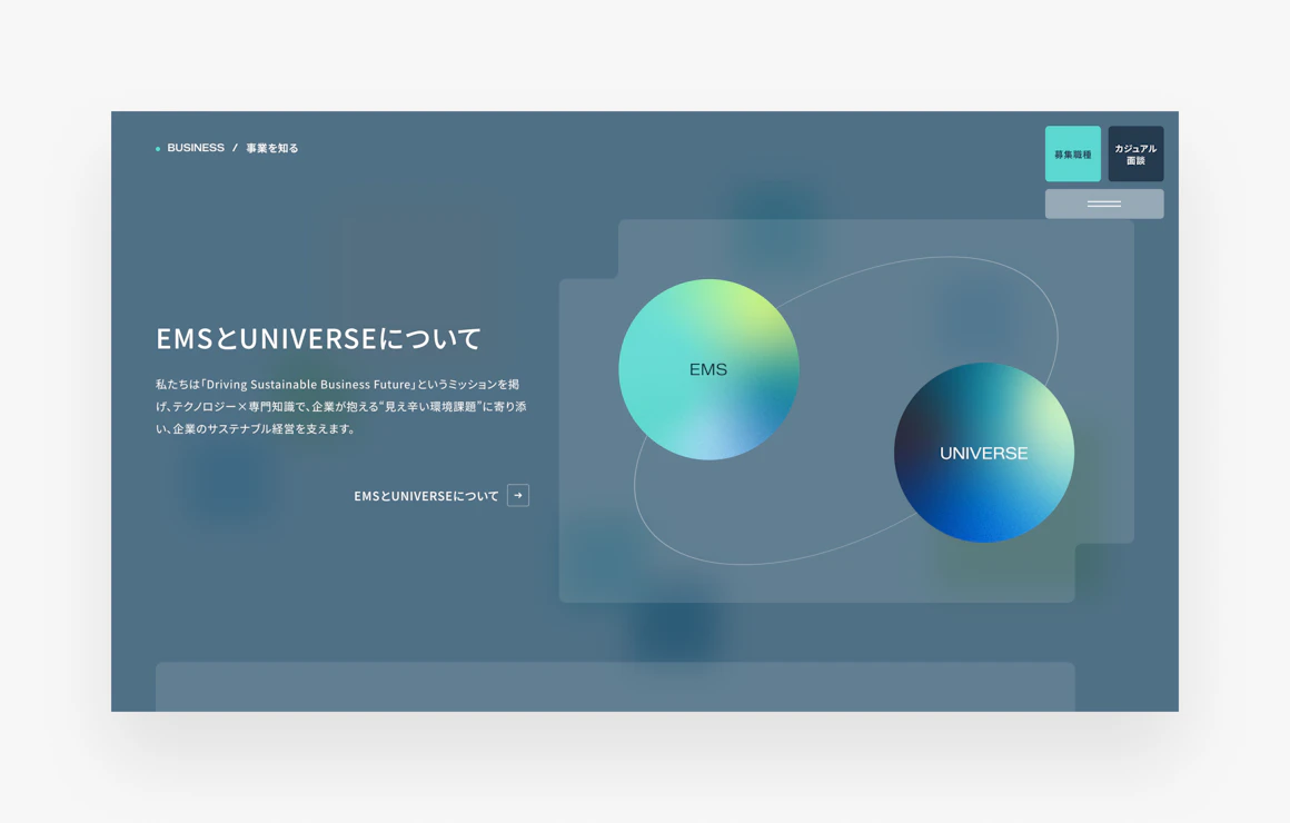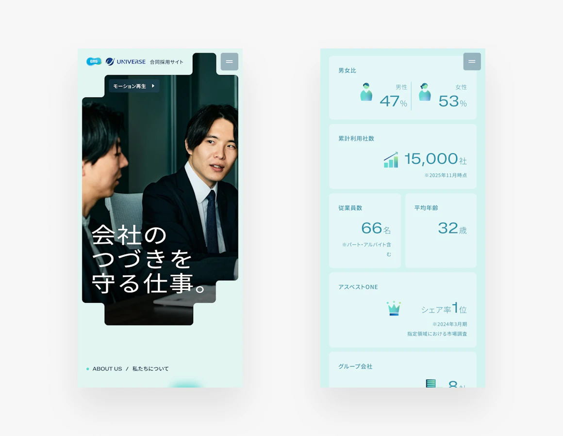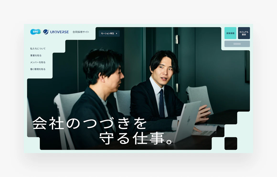 環境課題を解決する企業向けSaaSを提供する株式会社EMSと、環境コンサルティング事業を行う株式会社UNIVERSE。2社による合同採用サイトを制作しました。 それぞれ異なる強みを持つEMSとUNIVERSEが、ひとつひとつの個性(ピース)を重ねながら、共通のミッションのもとで未来を創っていく。その関係性を軸に、事業理解が自然に深めやすい情報設計と、写真を主役としたレイアウトで、職場の空気感や前向きな姿勢を表現しています。 誰もが情報にアクセスしやすいよう、ウェブアクセシビリティにも配慮しました。情報設計からコピーライティング、デザイン、撮影、フロントエンド開発、CMS構築まで一気通貫で担当しています。
